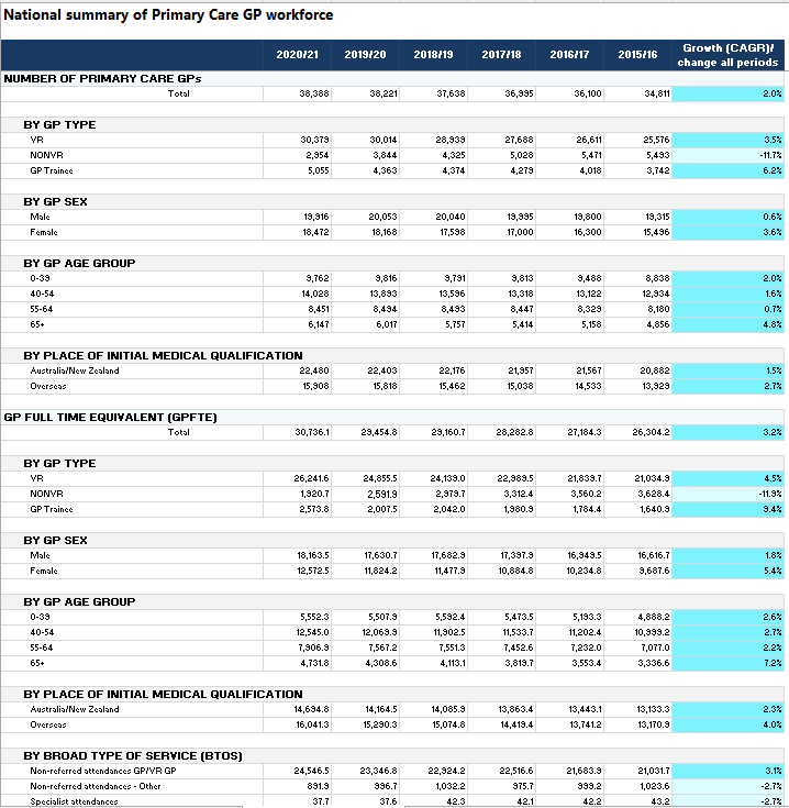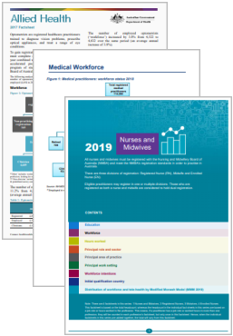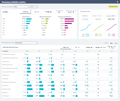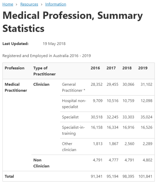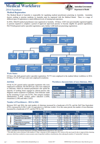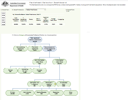 Summary Statistics for the Medical Profession, populated with statistics from the Health Workforce Data Tool using the National Health Workforce Dataset (NHWDS)