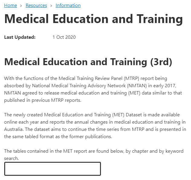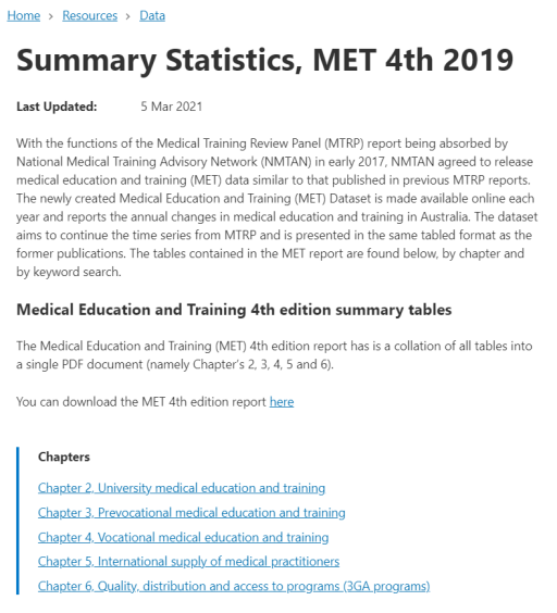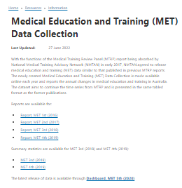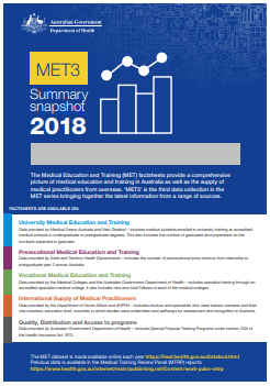 The Medical Education and Training (MET) factsheets provide a comprehensive picture of medical education and training in Australia as well as the supply of medical practitioners from overseas. ‘MET3’ is the third data collection in the MET series bringing together the latest information from a range of sources.